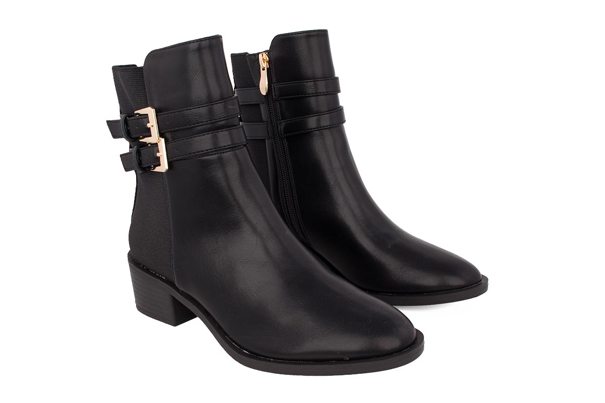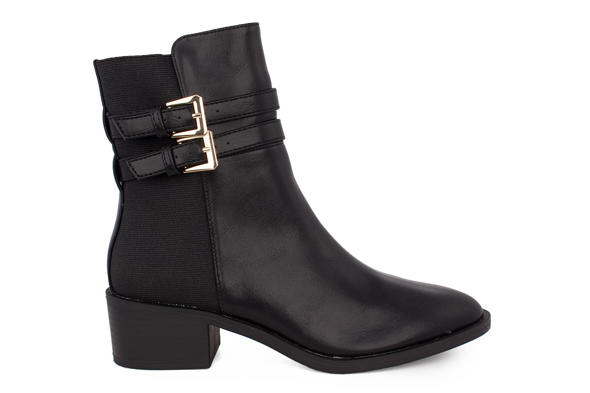 Γυναικεία μποτάκια μαύρα με εξωτερικές διακοσμητικές τόκες και εσωτερικό λειτουργικό φερμουάρ με λάστιχο εξωτερικά για εύκολη εφαρμογή ❗ Διαθέτουν αντιολισθητική σόλα και χαμηλό γεμάτο τακουνάκι για σταθερότητα και εντυπωσιακές εμφανίσεις.